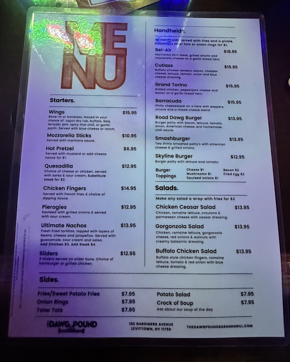 Welcome to The Dawg Pound Bar & Grill, located at 162 Gardiners Ave, Levittown, NY. This lively spot combines a warm atmosphere with a menu that delights bar food lovers.